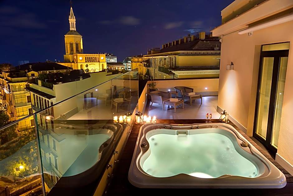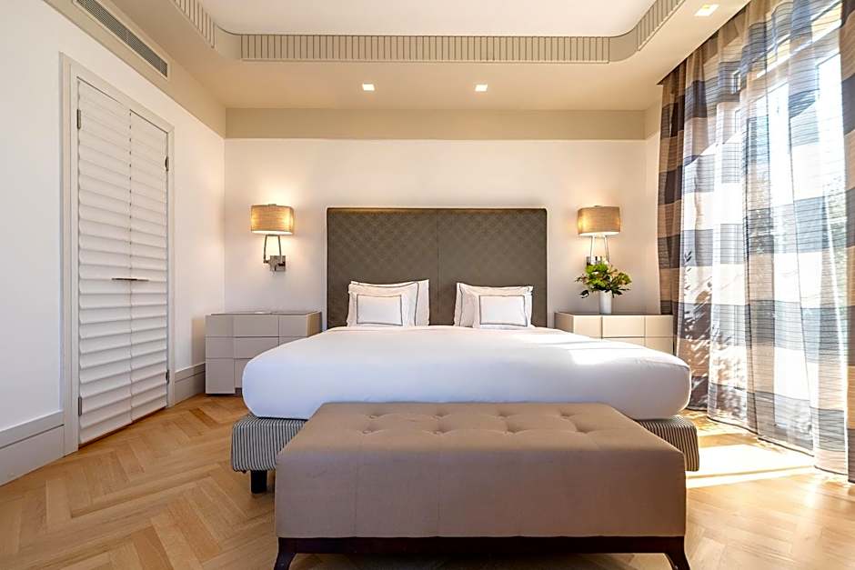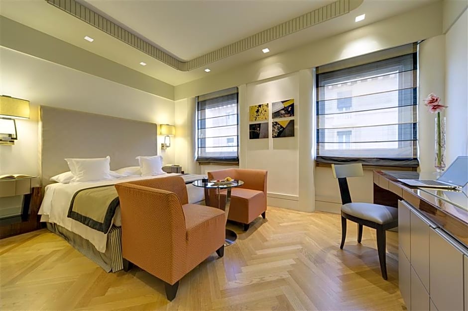 This luxury suite is on the top floor and has a private terrace overlooking Genoa and the Mediterranean Sea. It features separate living and sleeping areas, a 49" LCD TV, a walk-in wardrobe and a marble bathroom. This room offers an access to the wellness center.